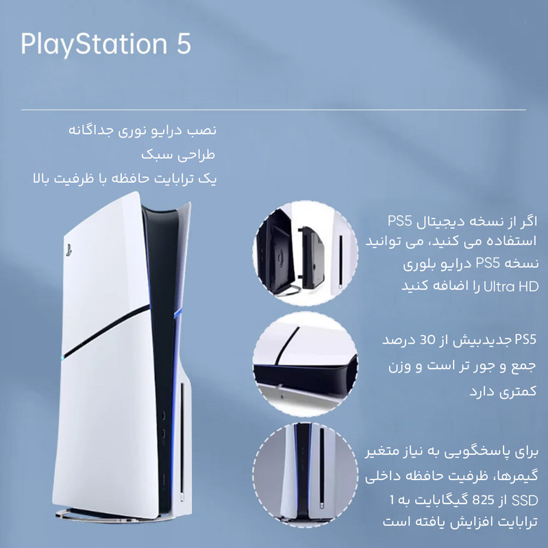پلیاستیشن 5 با طراحی مدرن و قدرت سختافزاری چشمگیر، تجربهای بینظیر برای گیمرها فراهم میکند. این دستگاه با یک حافظه داخلی SSD پرسرعت یک ترابایتی عرضه میشود که زمان بارگذاری بازیها را به حداقل میرساند و تجربهای روان ارائه میدهد. طراحی این کنسول با خطوط صاف و مدرن، ترکیبی از پلاستیک مقاوم و فلز است که نه تنها زیبا بلکه دوام بالایی دارد. ابعاد بزرگتر پلیاستیشن 5 اسلیم نسبت به نسلهای قبلی، به خاطر سیستم خنککننده پیشرفته و قطعات داخلی قدرتمند آن است، اما همچنان با توجه به کیفیت ساخت، حمل و نقل آن آسان است. پردازنده مرکزی این کنسول، پردازنده AMD Ryzen Zen 2 با هشت هسته و فرکانس متغیر تا 3.5 گیگاهرتز است که همراه با پردازنده گرافیکی RDNA 2 سفارشی با توان پردازشی 10.28 ترافلاپس، امکان اجرای بازیها با کیفیت 4K و نرخ فریم بالا را فراهم میکند. کنترلر DualSense، با طراحی ارگونومیک و ویژگیهای پیشرفته نظیر بازخورد لمسی (Haptic Feedback) و تریگرهای تطبیقپذیر (Adaptive Triggers)، تجربهای واقعگرایانه در گیمپلی ارائه میدهد.