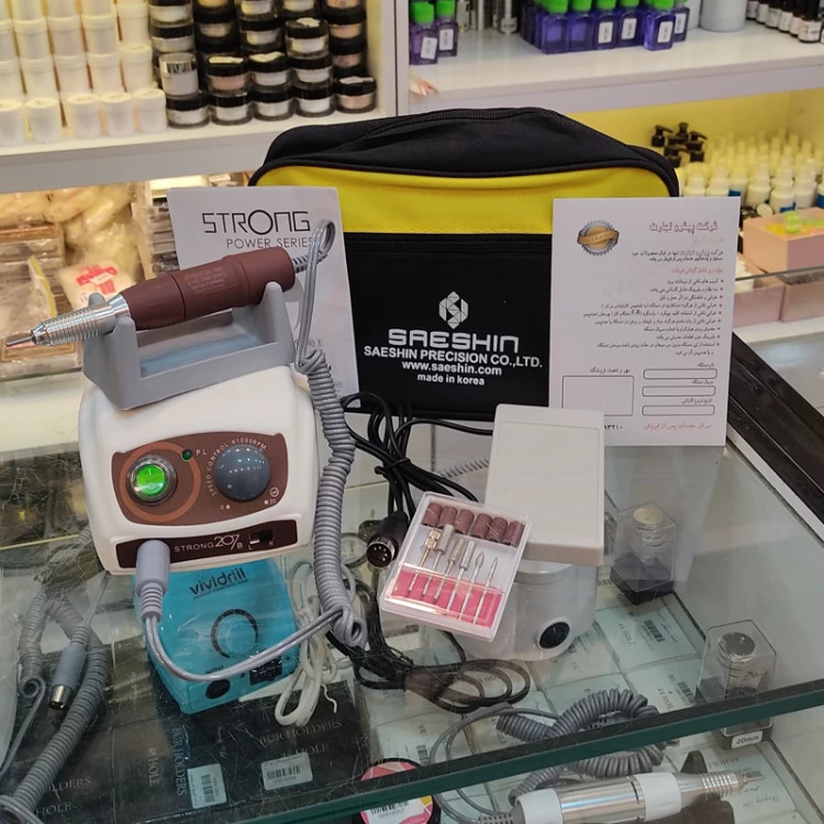 سوهان برقی استرانگ 207 دسته سبک با کارت گارانتی شرکتی با مهر و امضا فروشگاه و پک کامل سرسوهان و سرسمباده سوهان برقی ناخن