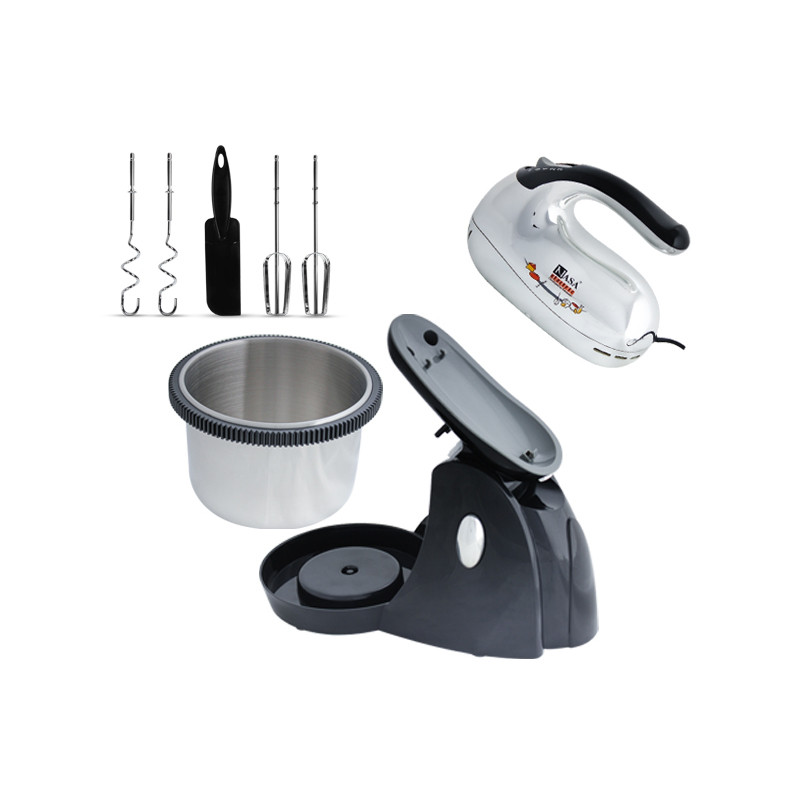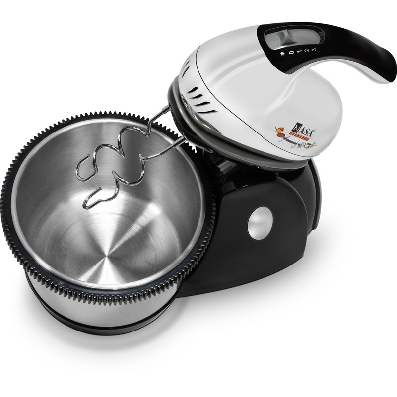 همزن ناسا الکتریک مدل NS-919 یکی از محصولات کاربردی و با کیفیت این برند محسوب میشود. این میکسر کاسه دار بوده که ظرفیت آن حداکثر 3 لیتر و از جنس استیل ضد زنگ میباشد و از مقاومت بسیار بالایی نیز برخوردار است. از این رو میتواند انتخاب مناسبی برای هر خانه و آشپزخانهای باشد. این دستگاه به دلیل داشتن موتوری قدرتمند و بدنه محکم قابلیت تهیه انواع خمیر، هم زدن انواع مواد غذایی مختلف و... را دارد. از دیگر ویژگیهای منحصر به فرد این همزن میتوان به امکان چرخش سه بعدی کاسه به صورت اتوماتیک اشاره کرد. همزن کاسه دار NS-919 قابلیت تنظم سرعت در سه سطح کم، متوسط و زیاد را دارد که میتوانید از درجه کند دستگاه برای هم زدن مخلوط در ابتدا و انتهای کارتان و یا برای استفاده در دسرهایی که نیازمند مخلوط سازی با دور کند هستند استفاده کنید، از دور متوسط آن برای آماده سازی مخلوطهایی که نیاز به زمان زیادتر برای مخلوط سازی دارند مانند سس مایونز و یا برخی از دسرها استفاده نمایید، با کمک دور تند دستگاه یک سفیده تخم مرغ پف کرده را برای انواع کیکهای پوک با پف زیاد آماده کنید. همزن کاسه دار ناسا الکتریک دارای دو سری همزن و خمیرزن میباشد. این میلهها از جنس استیل ضد زنگ با روکش کروم بوده و از کیفیت مطلوبی بهره میبرند. میلهی خمیرزن برای ورز دادن خمیر و میلهی همزن برای زدن سفیده تخم مرغ، خامه، انواع سس، مایهی کیک و … مورد استفاده قرار میگیرد.
