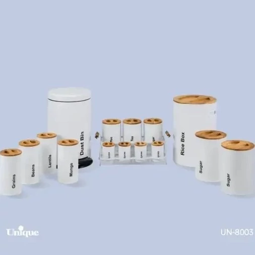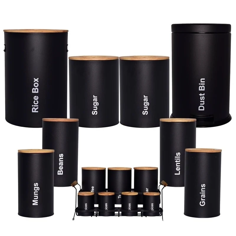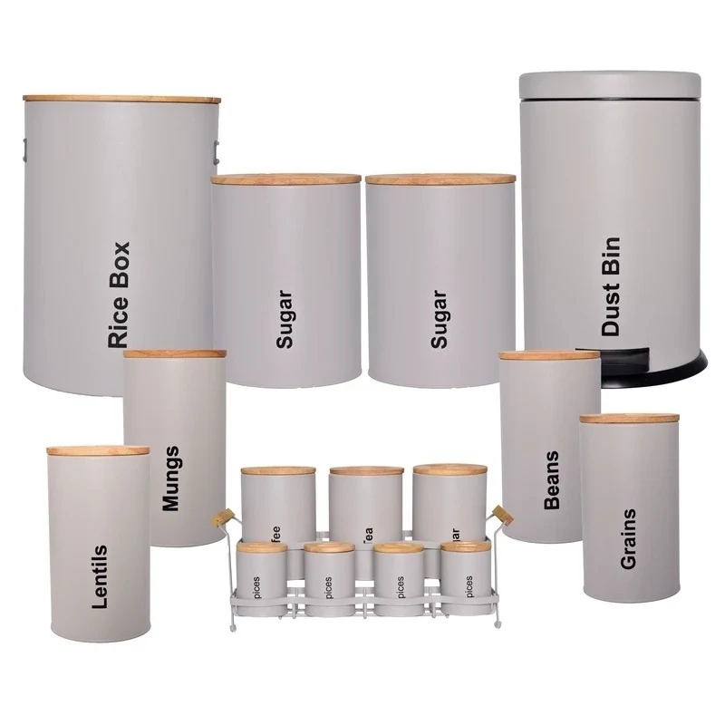 سطل برنج سطل زباله سطل قند و شکر 4 عدد حبوبات و ستاره ادویه و پاسماوری با استند تعداد 16 قلم شامل سطل زباله جای ادویه سطل برنج جنس فلز ابعاد بستهبندی 56x35x48 سانتیمتر وزن بستهبندی 11200 گرم