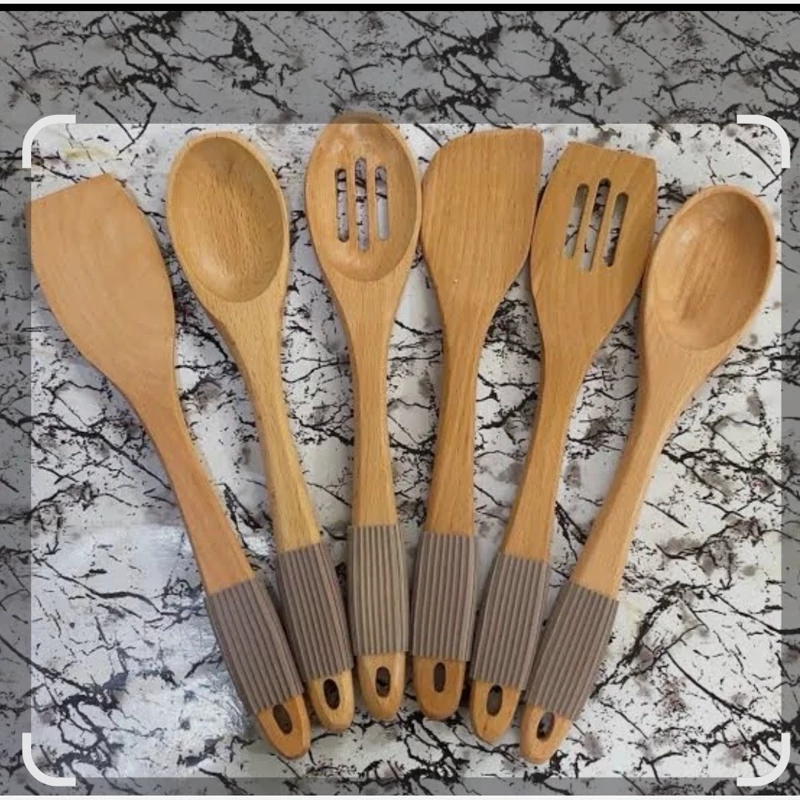 سرویس کفگیر و ملاقه چوب بامبو یونیک اصلی دسته سیلیکونی 6عددی فقط سیلیکون نسکافه ای رنگ بدون پایه