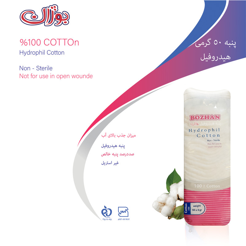 پنبه هیدروفیل 50 گرمی بوژان بسیار نرم و لطیف بوده و فاقد هرگونه آلایندگی خارجی می باشد. دارای کیفیت بالا و دارای مهر استاندارد بشماره 8930761912 و همچنین مجوز بهداشت و سیب سلامت بشماره 35/11075 می باشد. پنبههای هیدروفیل بوژان جهت پاک کردن مواد آرایشی و ضد عفونی کردن استفاده می شود و شما قادر خواهید بود با استفاده از پاککنندههای آرایشی یا محلول های ضد عفونی کننده این مهم را انجام دهید. البته این نکته را فراموش نکنید که از این پنبه به صورت مستقیم روی زخم باز استفاده نکنید و حتما از محلول های ضد عفونی کننده قبل از تماس با زخم استفاده شود. پنبه جزو لوازمی محسوب میشود که عموما برای مصارف مختلفی در مکانهای متفاوت مورد استفاده قرار میگیرد و به نوعی میتوان گفت پنبه از ملزوماتی است که در هر محیطی اعم از محیط کار، منزل و… وجود آن ضروری و مورد نیاز است.