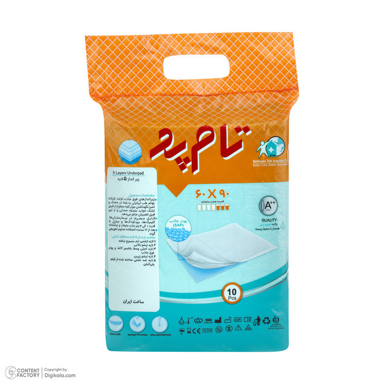 سایر توضیحاتزیر انداز بیمار آنتی باکتریال و ضد بو و حساسیت سایز60x90 سانتی متر تعداد در هر بسته 10 عدد با قدرت جذب بالا