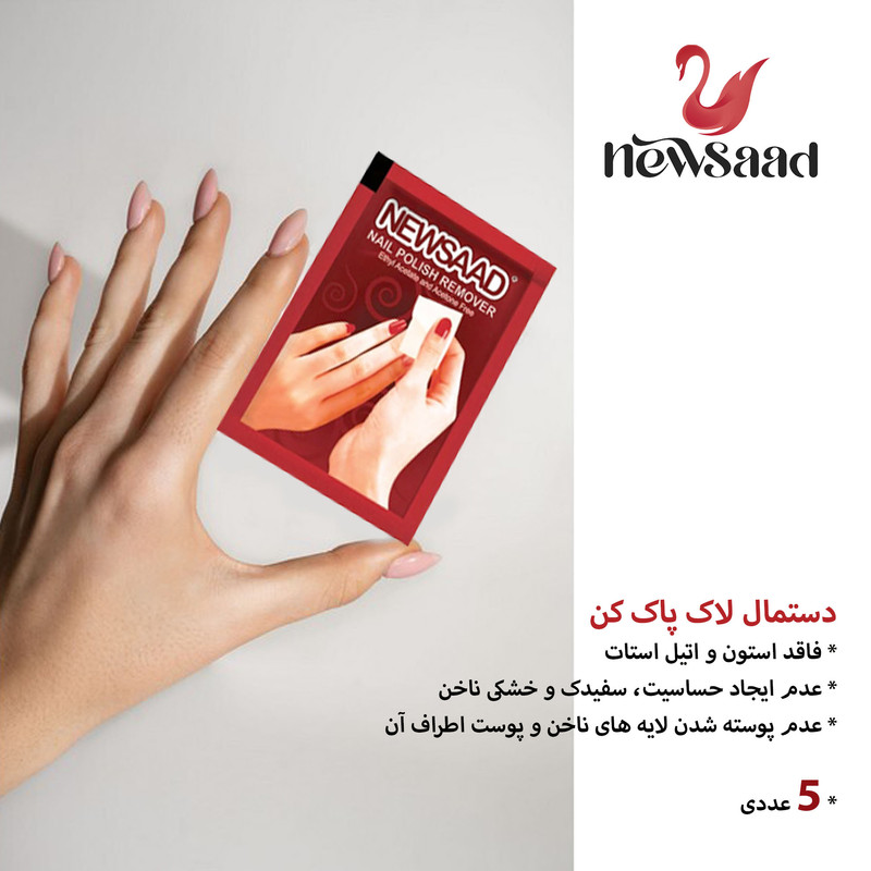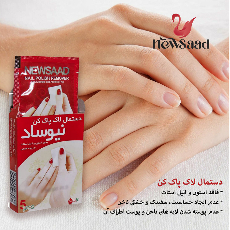 پد لاک پاک نیوساد قطعا جایگزین، مناسبی برای استون ها هستند، پد لاک پاک کن نیوساد، بدون استون، هیچ آسیبی به ناخن ها و دست وارد نمی کنند. این پد ها بدون ایجاد خشکی و حساسیت بر روی ناخن ها به راحتی باعث پاک شدن لاک از روی ناخن ها می شود. پد لاک پاک کن نیوساد با دارا بودن 5 پد لاک پاکن در بسته های جدا، به راحتی قابل حمل هستند. پد لاک پاک کن نیوساد بدون استون بوده و با بوی خوشی که دارد، ناخن ها را معطر کرده و لاک را به صورت کامل از رون ناخن ها پاک می کند. از سایر ویژگی های این محصول میتوان به: دارای رایحه طبیعی، پاک کننده انواع لاک، جایگزین مناسب استون، بسته بندی مجزا و قابل حمل، دارای 5 عدد پد لاک پاک کن، فاقد استون و اتیل استات، عدم ایجاد حساسیت، سفیدک و خشکی ناخن، عدم پوسته شدن لایه های ناخن و پوست اطراف آن اشاره کرد. در هربسته تعداد 5 عدد دستمال لاک پاک کن بصورت جداگانه بسته بندی شده است.