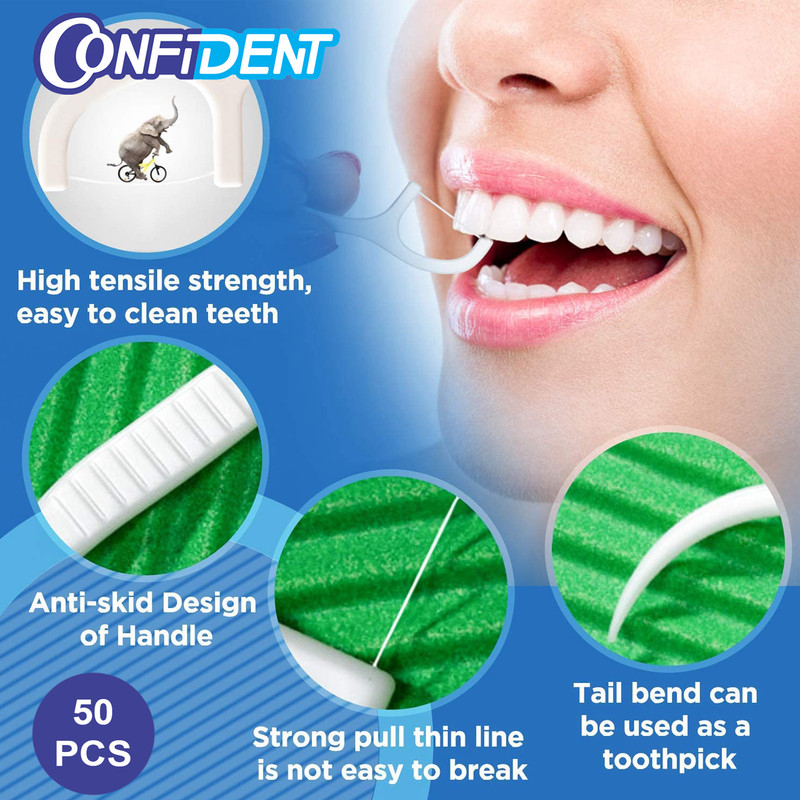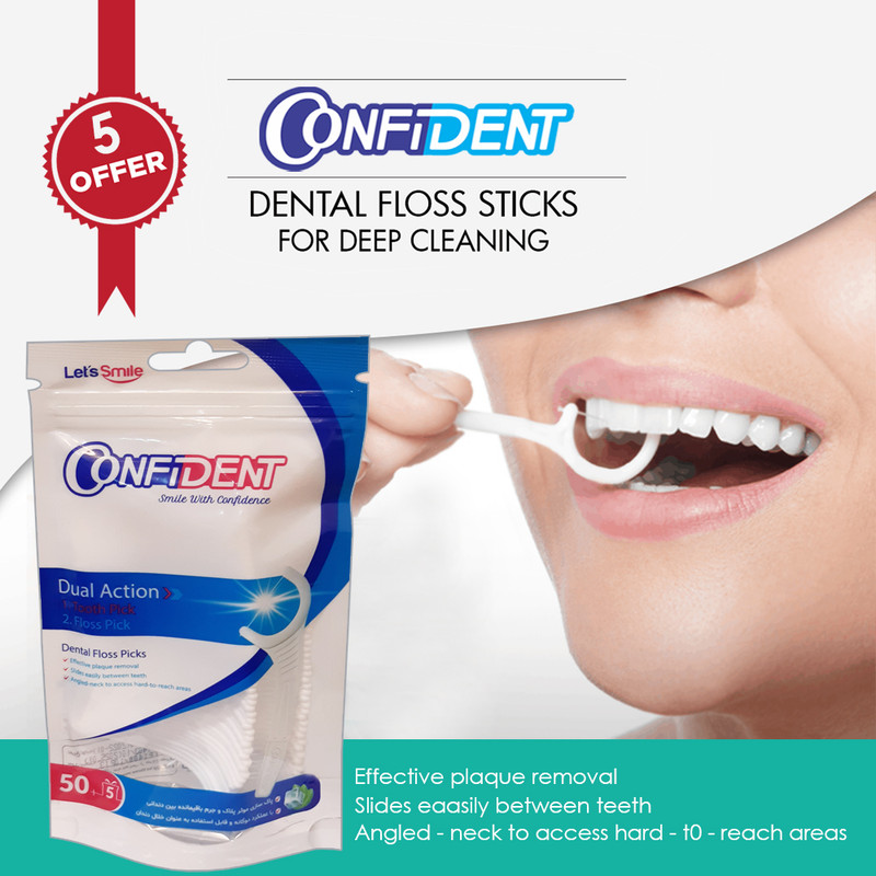 شما مصرف کننده عزیز و گرامی با خرید این پکیج سوپر مقرون به صرفه و عالی، تعداد 5 بسته 50 عددی( به عبارتی 200 عدد) نخ دندان کمانی کانفیدنت با عملکرد دوگانه ( نخ دندان+ خلال دندان) تحویل می گیرید. نخ دندان خلالی کانفیدنت مناسب انواع دندان و یک تمیز کننده بسیار عالی برای سطوحی از دندان که مسواک قادر به نفوذ و تمیز کردن آن ها نیست، می باشد. این محصول، به دلیل ساخت و ظاهر هوشمندانه و تماس نداشتن دست با نخ دندان از نخ دندان های معمولی دیگر بهداشتی تر می باشد و همچنین قسمت پایین این نخ دندان خلالی، از نخ جدا و تبدیل به یک خلال ، برای خلال بین دندانی می گردد. نخ دندان خلالی کانفیدنت علاوه بر اینکه مناسب دندان های زیبا شما هستند برا ی دندان هایی که ارتودنسی، کامپوزیت، لامینت و زیرکونیوم شده اند نیز بسیار کارآمد می باشد.