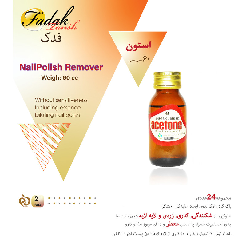 شما مصرف کننده عزیز و گرامی با خرید این مجموعه تعداد 24 عدد استون 100% خالص فدک تانیش را دریافت می نمایید.از موارد مهم استون فدک تانیش می توان به خلوص استون که یکی از مهمترین مسائل در انتخاب یک استون مناسب برای ریموو کردن ناخن می باشد اشاره کرد.استون های 100% فدک تانیش بهترین گزینه برای این کار است، هر میزان که استون خالص تر باشد سرعت ریموو کردن مواد از روی ناخن بالاتر می رود.از دیگر فواید استون فدک تانیش می توان به تقویت نرمی کوتیکول ناخن، جلوگیری از شکنندگی ناخن، اسانس معطر، جلوگیری از پوسته پوسته شدن پوست اطراف ناخن، جلوگیری از زرد شدن ناخن و عدم حساسیت نیز اشاره کرد.استون فدک از محصولات با کیفیت و نام آشنای ساخت ایران بوده که از خلوص بالایی برخوردار است و برای ریموو کردن ناخن کاشت شده مناسب می باشد.