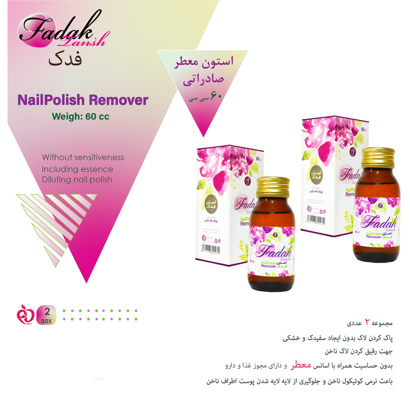 شما مصرف کننده عزیز و گرامی با خرید این مجموعه تعداد 2 عدد استون 100% خالص صادراتی فدک تانیش را دریافت می نمایید.از موارد مهم استون فدک تانیش می توان به خلوص استون که یکی از مهمترین مسائل در انتخاب یک استون مناسب برای ریموو کردن ناخن می باشد اشاره کرد.استون های ۱۰۰% فدک تانیش بهترین گزینه برای این کار است، هر میزان که استون خالص تر باشد سرعت ریموو کردن مواد از روی ناخن بالاتر می رود.از دیگر فواید استون فدک تانیش می توان به تقویت نرمی کوتیکول ناخن، جلوگیری از شکنندگی ناخن، اسانس معطر، جلوگیری از پوسته پوسته شدن پوست اطراف ناخن، جلوگیری از زرد شدن ناخن و عدم حساسیت نیز اشاره کرد.استون فدک از محصولات با کیفیت و نام آشنای ساخت ایران بوده که از خلوص بالایی برخوردار است و برای ریموو کردن ناخن کاشت شده مناسب می باشد.