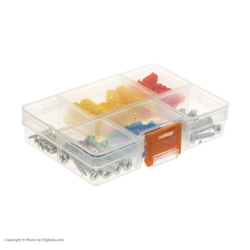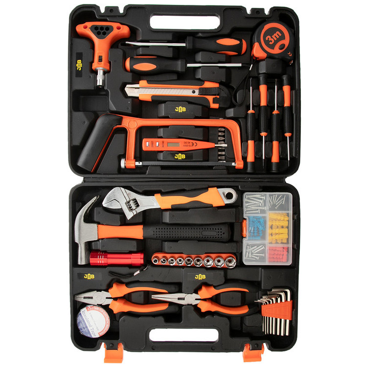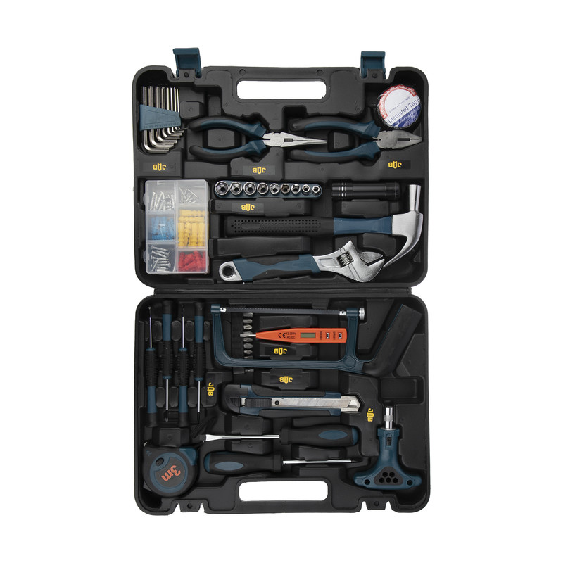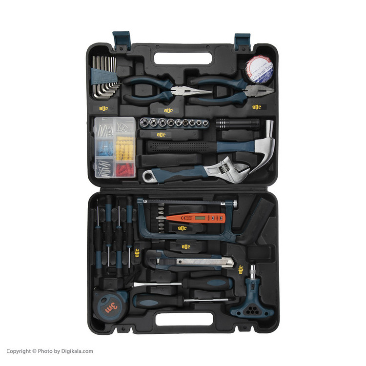 محتویات مجموعه: آچار آلن , آچار بکس , آچار فرانسه , اره همهکاره , انبر دم باریک , انبردست , پیچ , پیچ گوشتی , تیغ کاتر , چراغ قوه , چسب , چکش , سری بکس , فازمتر , کیف ابزار , متر , مته , میخ