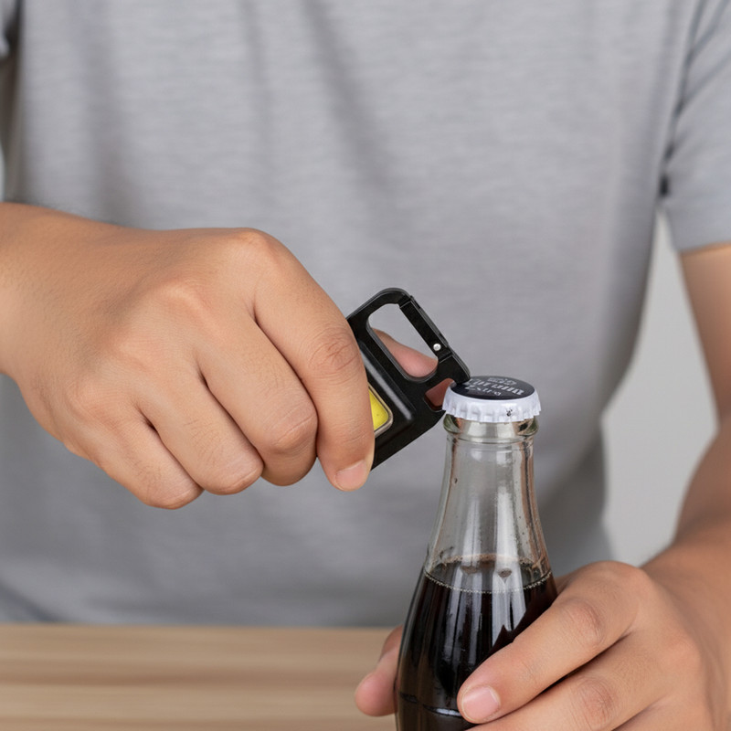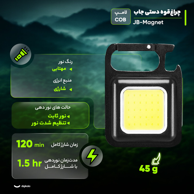 چراغقوه جمعوجور و قدرتمند که برای استفاده در همهجا و برای همهکس ضروری به نظر میرسد؛ در خانه، محل کار، خودرو، پارک، کوهنوردی و .... این چراغقوه از مواد اولیه درجه یک ساخته شده و کیفیت بسیار عالی دارد جنس بدنه از آلیاژ آلومینیوم است که علاوه بر حجم جمعوجور آن، آن را سبک هم ساخته است. با فشاردادن کلید روشن خاموشکن چراغقوه سه حالت کمنور- پر نور و چشمکزن فعال میشود و برای استفاده از حداکثر توان باید کلید را فشار داده و نگهدارید. در این چراغقوه حالتهای مختلفی برای سهولت استفاده تعبیه شده مانند آهنربای قوی ، گیره تکیه کننده، قفل جاکلیدی و آویز و همچنین یک در بازکن بطری نیز در آن تعبیه شده است و آن را به یک همراه کامل یا یک جاکلیدی کامل تبدیل کرده است .