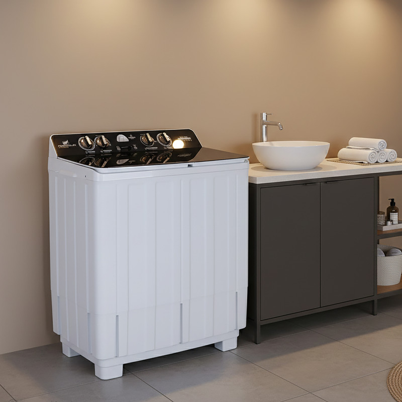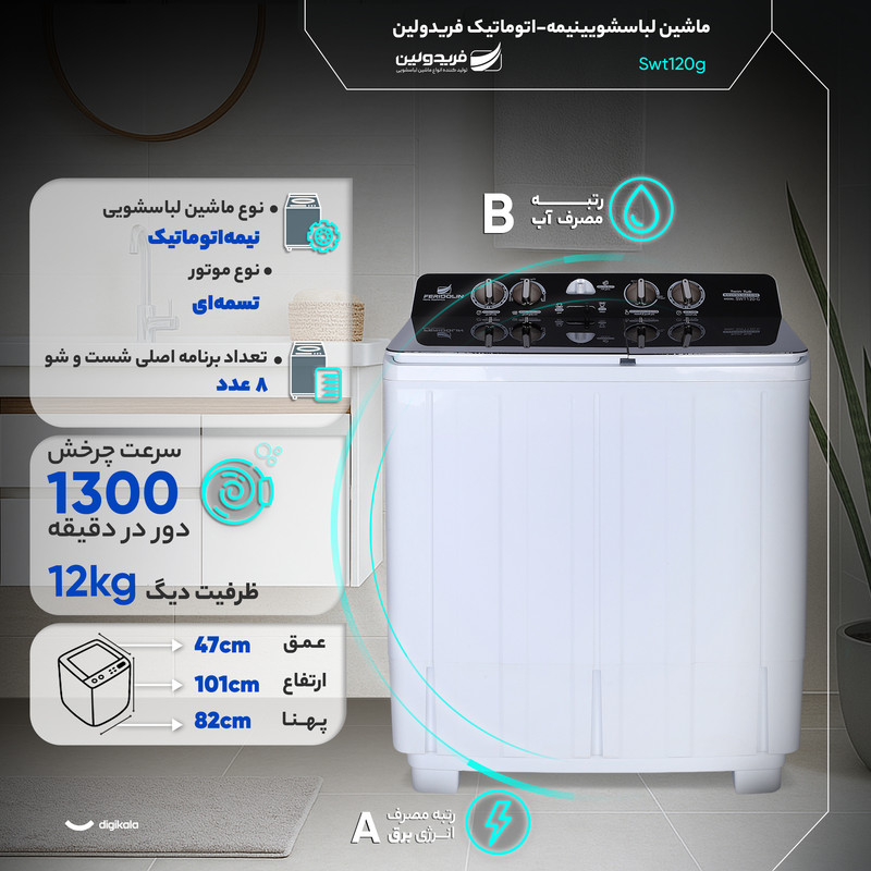 ماشین لباسشویی ۱۲ کیلوگرم نیمهاتوماتیک فریدولین مدل Swt120g گزینهای کاربردی برای خانوادههایی است که به دنبال دستگاهی کممصرف، بادوام و مناسب برای شستوشوی حجم زیاد لباس هستند. این مدل با طراحی درب از بالا و بدنهای از جنس پلاستیک مقاوم ساخته شده و ابعاد ۱۰۱ سانتیمتر ارتفاع، ۸۲ سانتیمتر پهنا و ۴۷ سانتیمتر عمق باعث میشود در فضاهای کوچک نیز بهراحتی قابل نصب باشد. نوع کنترل دستگاه بهصورت چرخشی طراحی شده تا استفاده از آن ساده و مستقیم باشد و کاربران بتوانند تنظیمات مختلف را بدون پیچیدگی انتخاب کنند. همراه دستگاه دفترچه راهنما قرار دارد تا نحوه استفاده، نگهداری و بهرهگیری از امکانات ویژه بهطور کامل توضیح داده شود.