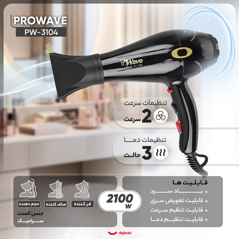 سشوار «پروویو» (Prowave) مدل «PW-3104» دارای موتور 1800 تا 2200 وات از نوع AC بوده که آن را مناسب استفاده در سالنهای آرایشی کرده است. به کمک موتور AC به کار رفته در این مدل میتوان موتور سشوار را مدت بیشتری روشن نگه داشت بدون اینکه آسیبی به آن وارد شود. روی بدنه سه دکمه مختلف وجود دارد. به کمک دکمهی تنظیم سرعت میتوان سرعت باد را بین دو حالت تغییر داد. برای تغییر دمای باد هم میتوان از دکمهی سهحالته استفاده کرد و به کمک آن حرارت سشوار را در یکی از سه حالت موردنظر تنظیم کرد. به طور کلی 6 حالت مختلف سرعت و حرارت باد وجود دارد که با توجه به کاربری و نوع مو از یکی از آنها استفاده میشود. بعد از حالت دادن به موها میتوان توسط دکمهی باد سرد، به تثبیت حالت مو کمک کرد. این دکمه حالت فنری دارد و باید با انگشت نگه داشته شود. طبق انتظار یک متمرکز کنندهی باد به عرض 7 سانتی متر نیز همراه سشوار ارائه شده است که برای خشک کردن و حالت دادن به موها استفاده میشود. بدنهی سشوار طراحی ارگونومیکی دارد و در پشت دستهی آن شیارهایی برای کنترل بهتر سشوار در دست دیده میشود. در قسمت ورودی باد سشوار فیلتر هوای آن قرار دارد. میتوان این فیلتر را به شکل چرخشی باز کرده و تمیز کرد. سیم سشوار 1.6 متر طول دارد و در محل اتصال به بدنه دارای یک حلقه پلاستیکی است که برای آویزان کردن سشوار استفاده میشود. به طور خلاصه Prowave PW-3104 دارای موتور 1800 تا 2200 وات AC، دو حالت تنظیم سرعت و سه حالت تنظیم حرارت، دکمهی باد سرد و فیلتر هوای قابل جدا شدن بوده و برای استفاده در سالنهای آرایش مناسب است.