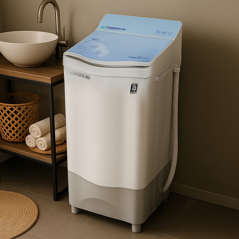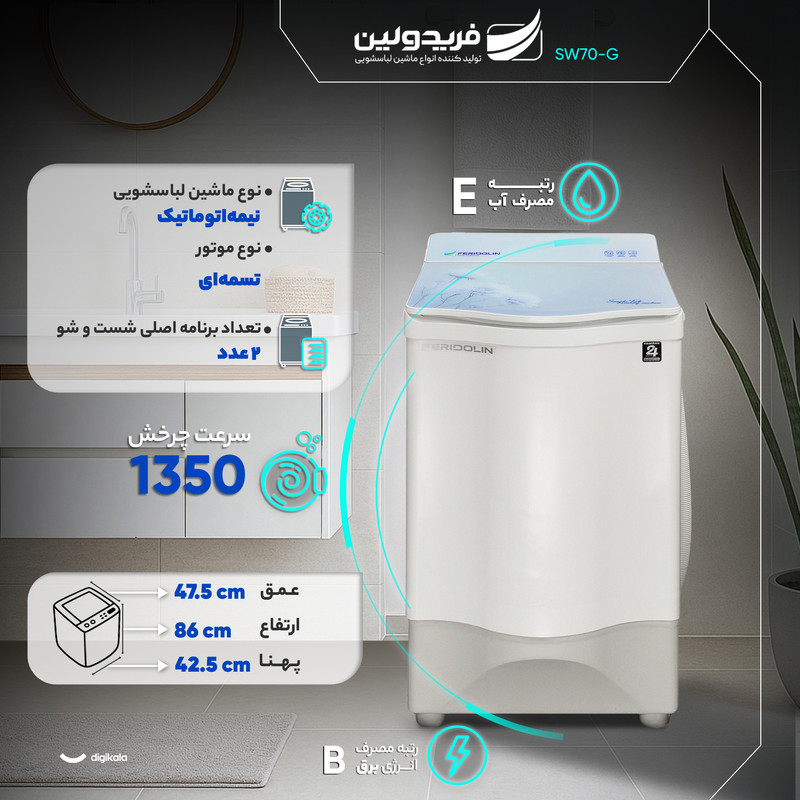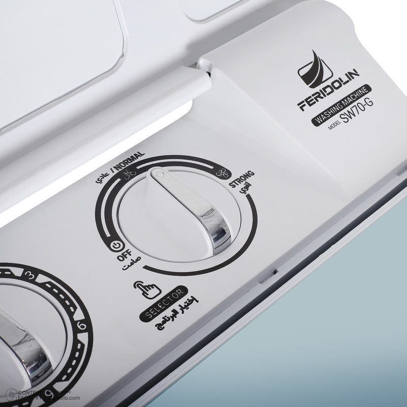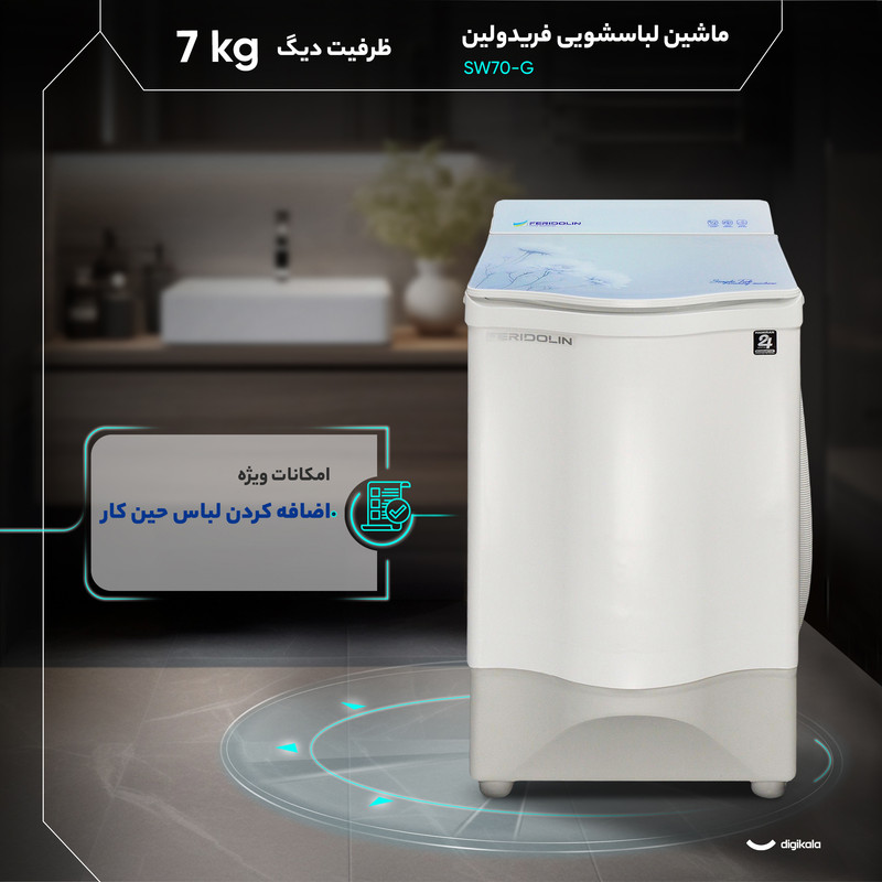 دستگاه «فریدولین» (Feridolin) مدل «SW70-G» یکی از ماشین لباسشوییهای کاربردی عرضهشده به بازار توسط این شرکت است که از طراحی ظاهری سادهای برخوردار است. جنس بدنه از پلاستیک است و فریم ABS ضد خط و خش دارد. این دستگاه از دسته ماشین لباسشوییهای در از بالا است که ظرفیت شستن 7 کیلوگرم لباس را دارد. همچنین به دلیل طراحی و ظرفیت مناسب این ماشین لباسشویی، امکان شستن انواع پتوی مسافرتی و یک نفره وجود دارد. طراحی جدید این محصول با درب شیشهای آن را به یک محصول زیبا و خاص تبدیل کرده است. در قسمت بالای این ماشین لباسشویی و در کنار در آن، دکمههای پیچی ولومی با کاربری آسان جهت تغییر تنظیمات بهصورت دستی در نظر گرفته شدهاند. این دکمهها امکان تنظیم زمان شستوشو از 3 تا 15 دقیقه و همچنین امکان تنظیم برنامه شستوشو را در سه حالت مختلف به کاربر میدهند. از دیگر ویژگیهای این دستگاه وجود رله حرارتی است که از سوختن موتور آن جلوگیری میکند. همچنین این مدل دارای سیفون تخلیه، سوپاپ تخلیه و فیلتر پرزگیر است که موجب بهبود عملکرد و بهرهوری دستگاه میشوند. ب در نظر داشته باشید که فریدولین، یک شرکت تولیدی صنعتی ایرانی است که بیش از 35 سال سابقه دارد. فعالیت اصلی فریدولین، در زمینهی تولید مینیواش و ماشینهای لباسشویی نیمهخودکار و خودکار در طرحها و مدلهای متنوع است. از ویژگیهای محصولات این شرکت میتوان به استفاده از فناوری روز در تولیدات، صرفهجویی در مصرف آب و مواد شوینده و کاهش زمان شستشوی لباسها اشاره کرد.