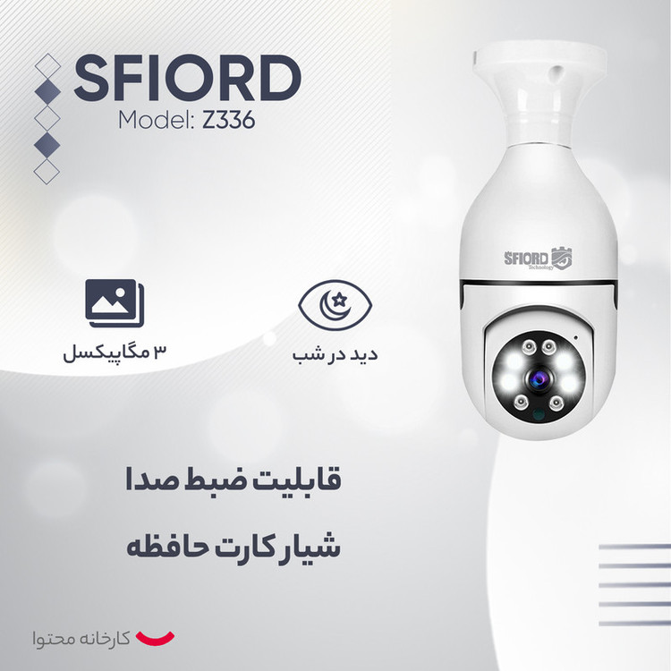 دوربین مداربسته اسفیورد مدل Z336 مخصوص گوشی های اندرویدی یک سیستم امنیتی کامل و باکیفیت با قیمتی اقتصادی است که به لطف بهرهمندی از جدیدترین تکنولوژیهای نظارت الکترونیک، عملکرد بسیار خوب و قابل قبولی ارائه میدهد. اپلیکیشن اندروید فارسی اختصاصی اسفیورد، امکان ذخیرهسازی تصاویر بر روی فضای ابری (CLOUD)، تکنولوژی دید در شب رنگی (استارلایت)، دزدگیر هوشمند با قابلیت تشخیص حرکات انسان و پخش آژیر و ارسال پیامک (SMS)، تکنولوژی دوآل اسکرین (نمایش دو تصویر همزمان) از مهمترین ویژگیهای این دوربین مداربسته اسفیورد هستند. (این دوربین صرفاً بر روی گوشیهای اندروید قابل استفاده است و بر روی گوشیهای شرکت اپل پشتیبانی نمیشود.) نصب سریع و ساده این دوربین بر روی تنها یک سرپیچ، یکی دیگر از امتیازهای آن است. مشابه سایر دوربینهای اسفیورد، این مدل نیز از سرورهای امن چندلایه انتقال تصویر P2P با مصرف اینترنت نیمبهای داخلی برای نمایش تصویر دوربین بر روی موبایل استفاده میکند. دوربین Z336 دارای کیفیت تصویر ۳MPX است که تصاویر را با کیفیت FULL HD ذخیره میکند. برای راهاندازی این دوربین نیازی به دستگاه ضبط و سیمکشی نیست و تنها کافی است نرمافزار مربوطه را روی گوشی موبایل نصب کرده و مطابق دفترچه راهنمای فارسی، دوربین را به مودم اینترنت متصل کنید تا بتوانید صدا و تصویر را بهراحتی بر روی گوشی موبایل از هر نقطه ایران مشاهده کنید. این دوربین بدون نیاز به اینترنت، صدا و تصویر را بر روی کارت حافظه ذخیره میکند و فقط کافی است یک مموری کارت microSD تا ظرفیت ۱۲۸ گیگابایت تهیه کنید. بازپخش تصاویر ضبطشده بهوسیله نرمافزار موبایل انجام میشود و بهراحتی میتوان از آنها خروجی گرفت. این دوربین برای نصب در فضاهای داخلی ساختمان مناسب است و امکان اشتراکگذاری تصاویر زنده روی موبایل تا ۱۰ نفر را فراهم میکند.