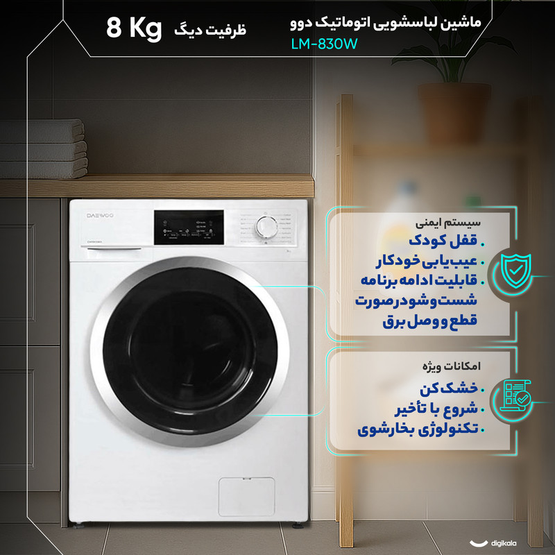 در بخش طراحی داخلی، ماشین لباسشویی 8 کیلوگرم اتوماتیک دوو مدل LM‑830W از دیگ استیل ضدزنگ با ساختار الماسه و محفظه شستوشوی زمردی استفاده میکند که علاوه بر افزایش کیفیت شستوشو، مانع آسیب دیدن الیاف لباس میشود. فناوری Potector‑I نیز نقش مهمی در محافظت از موتور و افزایش طول عمر دستگاه دارد. ابعاد ۸۲.۵ × ۶۰ × ۶۳ سانتیمتری، کنترل چرخشی و دکمهای، و نمایشگر دیجیتال مجموعه طراحی دستگاه را تکمیل میکنند. در مجموع این مدل گزینهای مناسب برای کاربران سختپسند است که به کیفیت شستوشوی بالا و مصرف انرژی بهینه اهمیت میدهند.