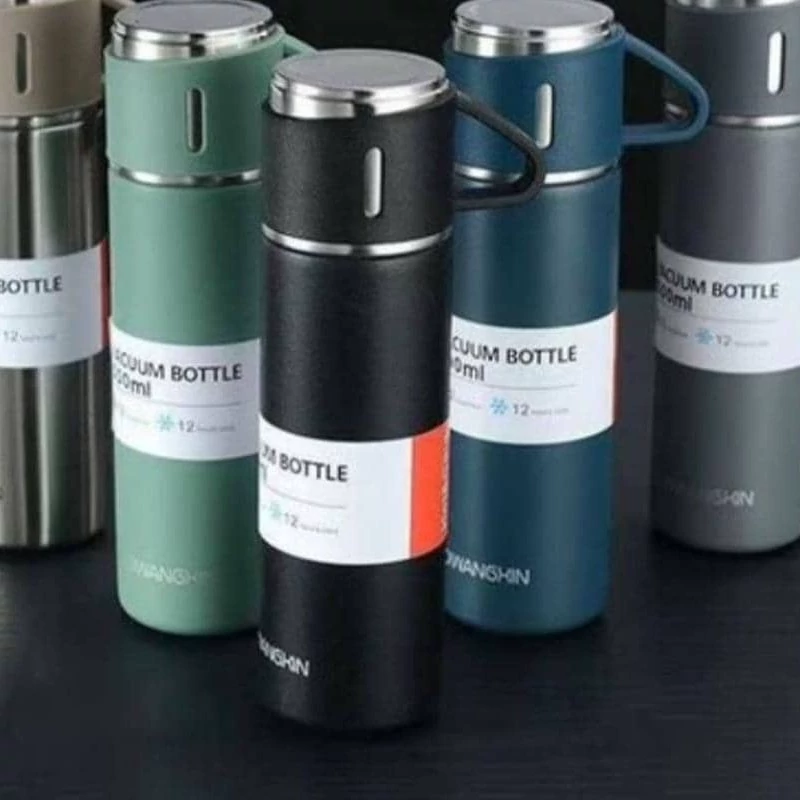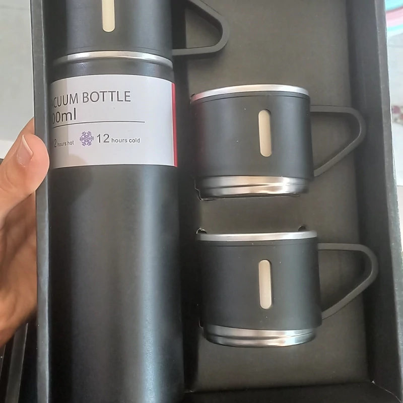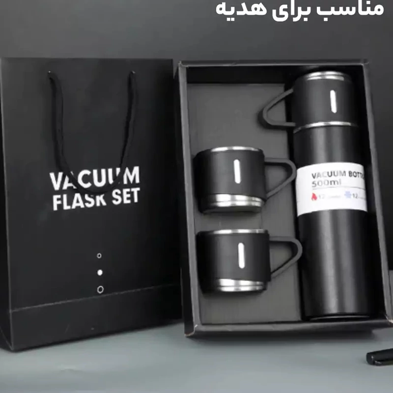 فلاسک سرد و گرم با گنجایش نیم لیتر دارای سه فنجان رنگ مشکی و آبی دارای باکس کادویی
