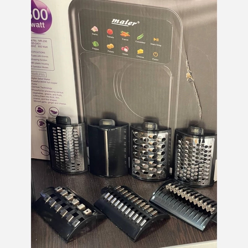 📌سالاد ساز مایر ✔️800 وات ✔️پنل لمسی ✔️8 برنامه پیش تنظیم ✔️7 تیغه رنده ریز و درشت و متوسط ،خلال کن ریز و درشت چیپس ساز و رشته کن