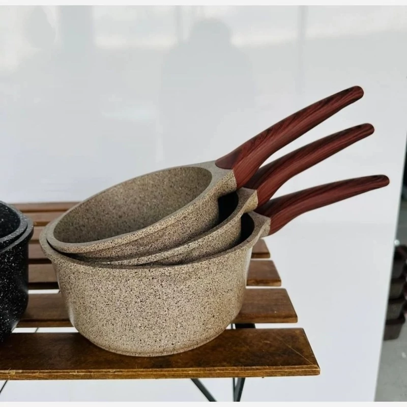 پوشش گرانیتی با دوام قابل استفاده در ماشین ظرفشویی دسته های راحت دوام عالی مقاومت در برابر دمای بالا مقاومت در برابر خراش سه شیرجوش با سایزهای 16 و 18 و 20 سانتی متر جنس دسته ها باکالیت نسوز